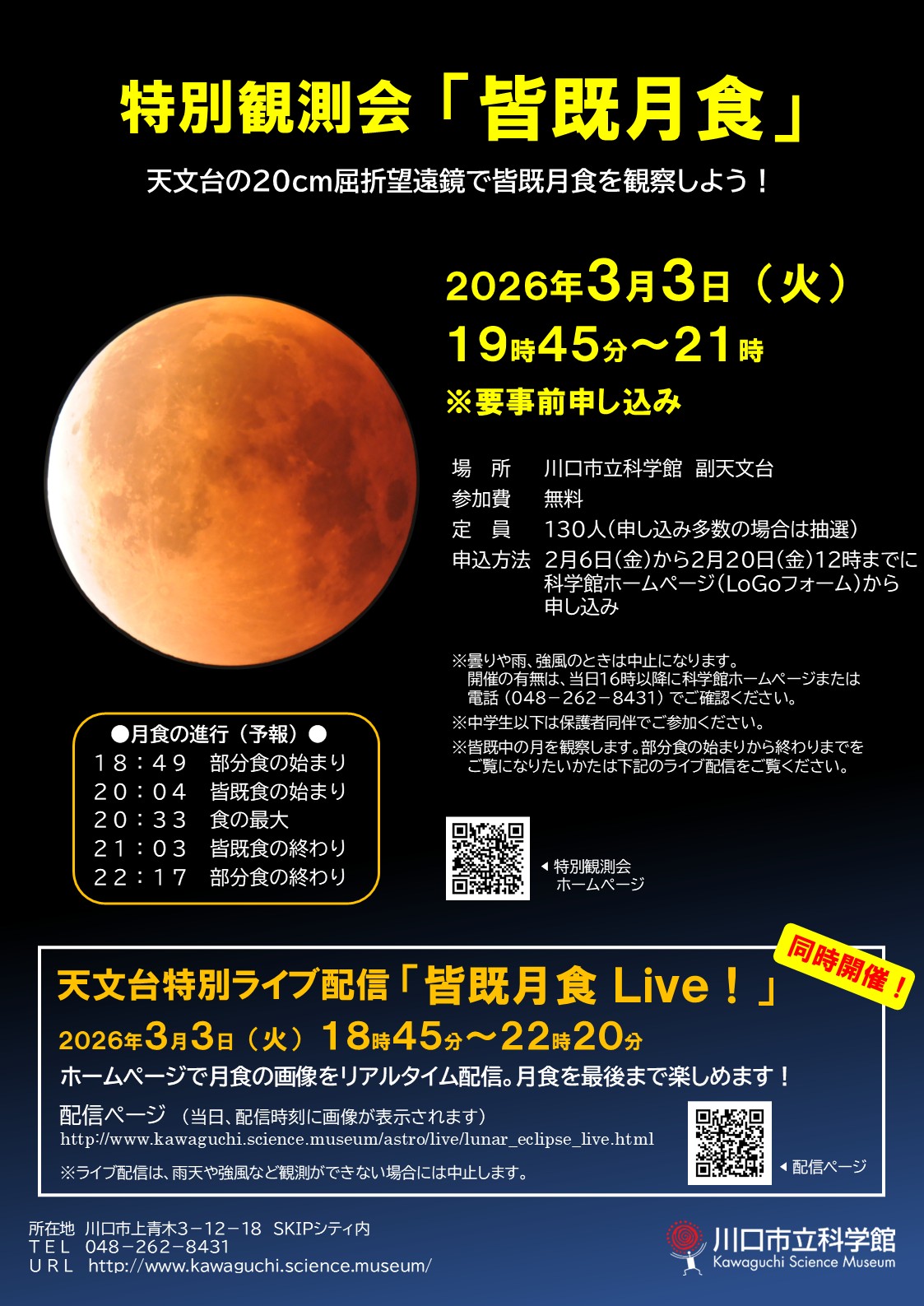 ・科学館入口での受付終了後、天文台の望遠鏡で皆既中の月を見ていただき、解散となります。部分月食の始まり(欠け始め)から終わりまでをご覧になりたいかたは、天文台特別ライブ配信「皆既月食 Live!」をご覧ください。