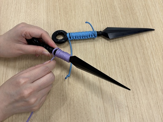 多くの忍者が使った万能工具「苦無(くない)」。手で握る部分に紐をしっかりと巻き、“マイくない”を作ります。